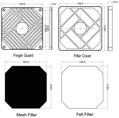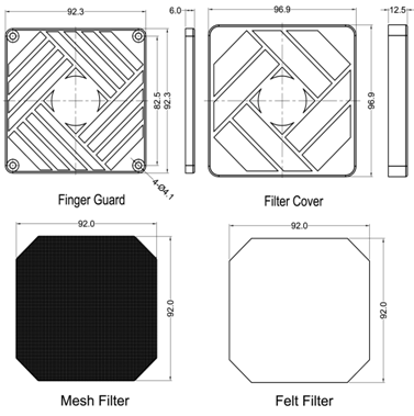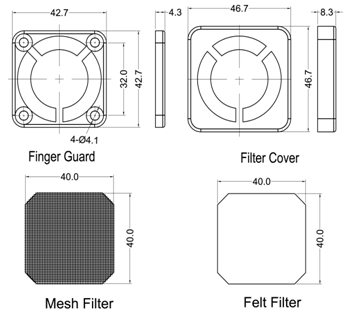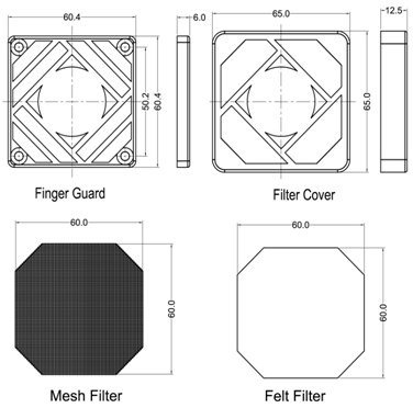 1. Filter Cover & Guard: PA66 30% Glass Filled UL 94V0; Color: Black Felt Filter: Polyester; Color: White 2.Mesh Filter: Stainless Steel AISI 304 Unit:mm